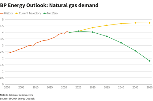 Natural gas and LNG. In the Current Trajectory scenario, natural gas demand continues to grow throughout the outlook, expanding by around a fifth by 2050.