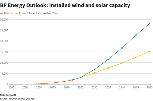 Wind and solar. Wind and solar capacity increase around eight-fold by 2050 in the Current Trajectory scenario and by a factor of 14 in Net Zero from 2022 levels.