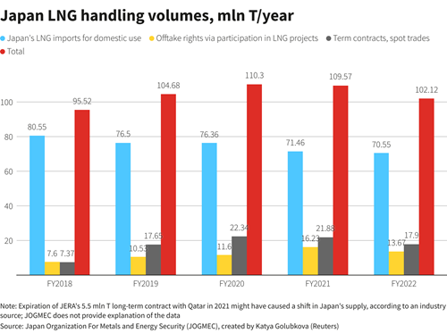 Destination clauses. Tokyo's growing LNG ambitions are reshaping its procurement strategy. In fiscal 2021, 53% of gas bought by Japanese firms, or 45 MMt, was under contracts banning resale, a condition imposed by producers such as Qatar, according to JOGMEC.