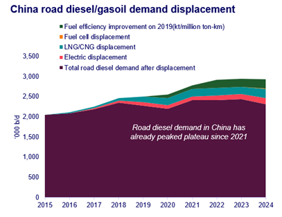This trend is borne out by diesel demand for road transport expected to fall from 2.3 MMbpd in 2023 to 0.7 MMbpd by 2050. “LNG-powered trucks are gaining in popularity, but should only be seen as a bridging solution,” Xia concludes. “Investment in electric or hydrogen fuel cell trucks to respond to future market demands will not only help to meet environmental requirements, but could also give companies a long-term competitive advantage”