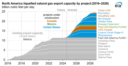North America’s LNG export capacity is on track to more than double between 2024 and 2028, from 11.4 billion cubic feet per day (Bcfd) in 2023 to 24.4 Bcfd in 2028, if projects currently under construction begin operations as planned. During this time, we expect developers in Mexico and Canada to place their first LNG export terminals into service and in the United States to add to existing LNG capacity. By the end of 2028, we estimate LNG export capacity will grow by 0.8 Bcfd in Mexico, 2.5 Bcfd in Canada, and 9.7 Bcfd in the United States from a total of 10 new projects that are currently under construction in the three countries.