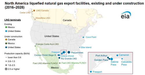 - The Energia Costa Azul LNG export terminal (0.4 Bcf/d export capacity) is located at the site of the existing LNG regasification (import) terminal in Baja California in western Mexico. Developers proposed an expansion of this project in Phase 2 by 1.6 Bcf/d. This project will be supplied with natural gas from the Permian Basin in the United States.
