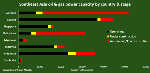 Big plans. Close to 100,000 megawatts (MW) of gas-fired power generation is either already under construction or has been announced across Southeast Asia, according to Global Energy Monitor (GEM).