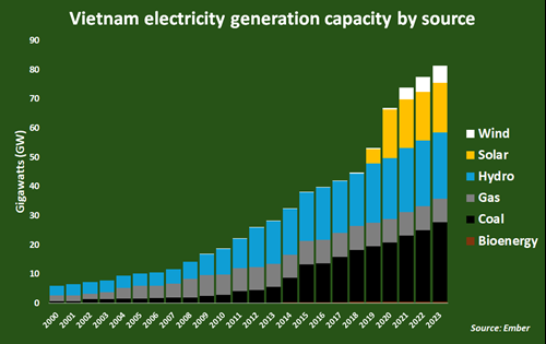 From 2018 to 2023, Vietnam's clean electricity generation capacity jumped by 146% to 46 GW.