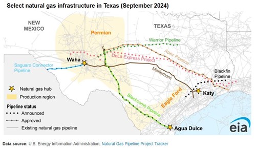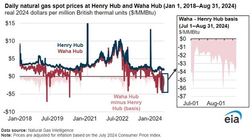 When regional growth in natural gas production outpaces pipeline takeaway capacity additions, capacity constraints exert downward pressure on spot natural gas prices at the Waha Hub, which is near Permian Basin production.
