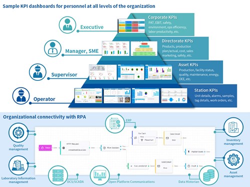 By utilizing RPA implemented in a low-code / no-code environment or through customization by Yokogawa, this data integration solution can significantly reduce reporting time. OpreX Intelligent Manufacturing Hub covers the full range of key performance indicators (KPIs), workflows and reporting at every level of the organization, from the C-suite to the plant floor, and employs a single database to integrate and display on dashboards data that customers need to make the right decision at the right time.