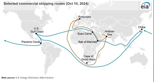The Suez Canal, the SUMED pipeline and the Bab el-Mandeb Strait are strategic routes for Persian Gulf oil and natural gas shipments to Europe and North America. The Suez Canal and SUMED pipeline are located in Egypt and connect the Red Sea with the Mediterranean Sea. The volume of crude oil and oil products flowing around the Cape of Good Hope increased to 9.2 MMbpd in the first eight months of 2024 from an average of 6 MMbpd in 2023, according to Vortexa data.