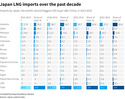 Japan's LNG demand is falling due to nuclear reactor restarts, more renewable energy and a slowing economy. Imports fell to 66 MM tonnes in 2023, from 83 MM tonnes in 2018, Japan customs data shows.