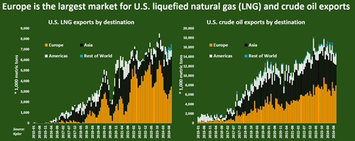 However, Europe is also the single largest market for both U.S. LNG and crude oil exports, accounting for 49% of all U.S. LNG shipments and 47% of U.S. crude exports this year, according to ship-tracking data from Kpler.