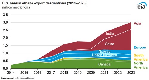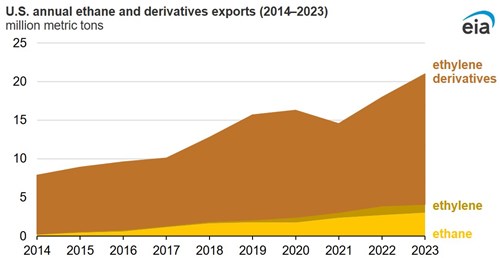 U.S. exports of ethane and ethane-based petrochemicals rose 135% from 2014 to 2023