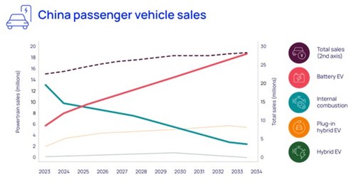 China’s transport sector is also undergoing a significant transformation. By 2034, battery electric vehicles (BEVs) will dominate passenger vehicle sales, reaching a 66% market share. Combining BEVs and hybrids, EVs will constitute 89% of total sales, according to Wood Mackenzie.