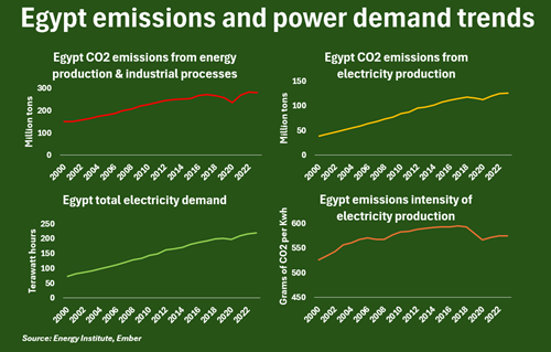 In 2023, Egypt discharged 279 MMt of CO2 from energy production and industrial processes, according to the Energy Institute, the most among North African nations and the 25th largest globally.