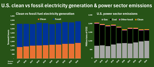 Coal vs. clean. Thanks to the cuts to coal use, total U.S. power emissions from all fossil fuels were up only 0.5% in 2024 from 2023 to 1.64 Bt, and were down 19% since 2015.