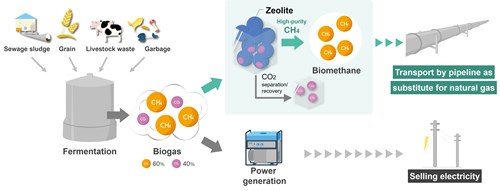 The System separates CO2 and methane from biogas using the optimum combination of a special zeolite as adsorbent that selectively adsorbs CO2 and a special pressure vacuum swing adsorption (PVSA) process technology. The zeolite is a crystalline aluminosilicate having regular channels (pores) controlled on the order of angstroms (ten-millionths of a millimeter) and cavities (voids) with a specific surface area exceeding several hundred square meters per gram. Asahi Kasei’s PVSA process technology, which separates specific gases by changes in pressure, enables the removal of CO2 from biogas to refine high-purity methane gas (biomethane) at a high recovery rate.