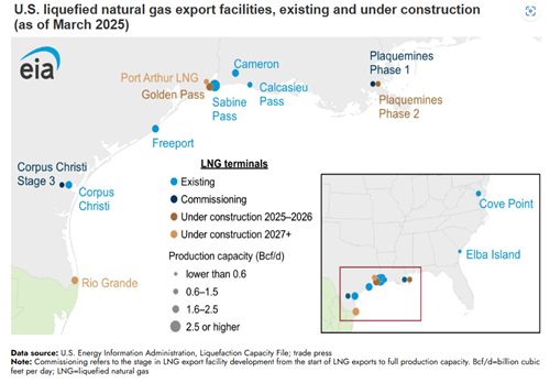U.S. LNG export facilities, existing and under construction. Source: U.S. Energy Information Administration (EIA), Liquefaction Capacity File.