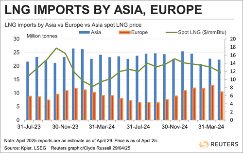 Asia's imports of liquefied natural gas (LNG) remained tepid in April while Europe's started to show signs of the usual seasonal easing as winter peak demand passed.
