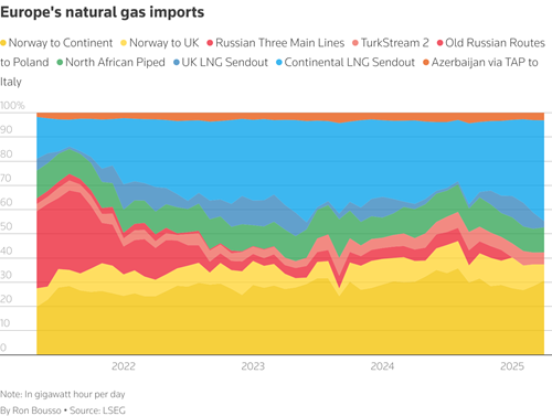 LNG today makes up over a third of European supplies, with 45% coming from the United States and another 19% from Russia in 2024. Beyond LNG, Europe imports gas from Norway, North Africa and Turkey via pipeline.