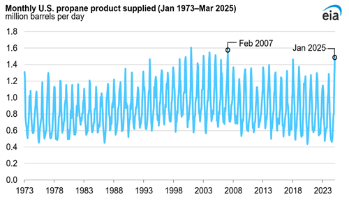 U.S. propane consumption reached 1.48 MMbpd in January 2025, the most January consumption on record since January 2005 and the most for any month since February 2007, as severe cold drove up heating demand across much of the country.