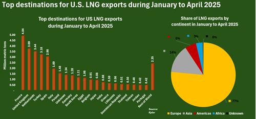 Top destinations. France, the United Kingdom and the Netherlands were the top three buyers of U.S. LNG during January to April, and together accounted for nearly 35% of total purchases.