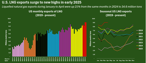 Total U.S. liquefied natural gas (LNG) shipments during January through April were 34.6 MM tonnes (t), according to trade intelligence firm Kpler, which was by far the highest volume total ever for that period.