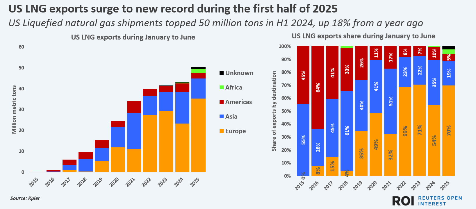 Over the first half of 2025, European markets accounted for 70% of all U.S. LNG exports, Kpler data shows, while Asian markets accounted for just under 20%.