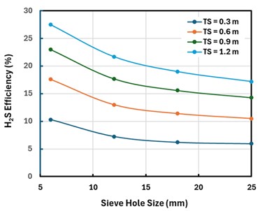 As might be expected, smaller sieve holes are quite beneficial to treater performance because they create smaller, more numerous droplets, presenting greater interfacial area and, therefore, better mass transfer. As can be seen in FIG. 2, this is the case for both H2S and CO2 removal, but it must be balanced against the greater plugging risk from small holes.