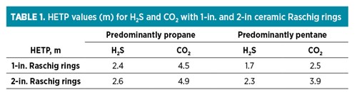 Effect of packing size. From the eight packed-treater data sets available, seven are packed with ceramic Raschig rings: all but one have a diameter of 2 in. It is instructive to examine the effect of packing size and material. TABLE 1 shows how little difference packing size makes to the HETP corresponding to the separation achieved by a single ideal stage when the organic phase is predominantly propane (LPG) compared with pentane. This is probably due to the higher viscosity pentane (0.18 cP) interacting more vigorously with the packing than propane (0.09 cP) does.
