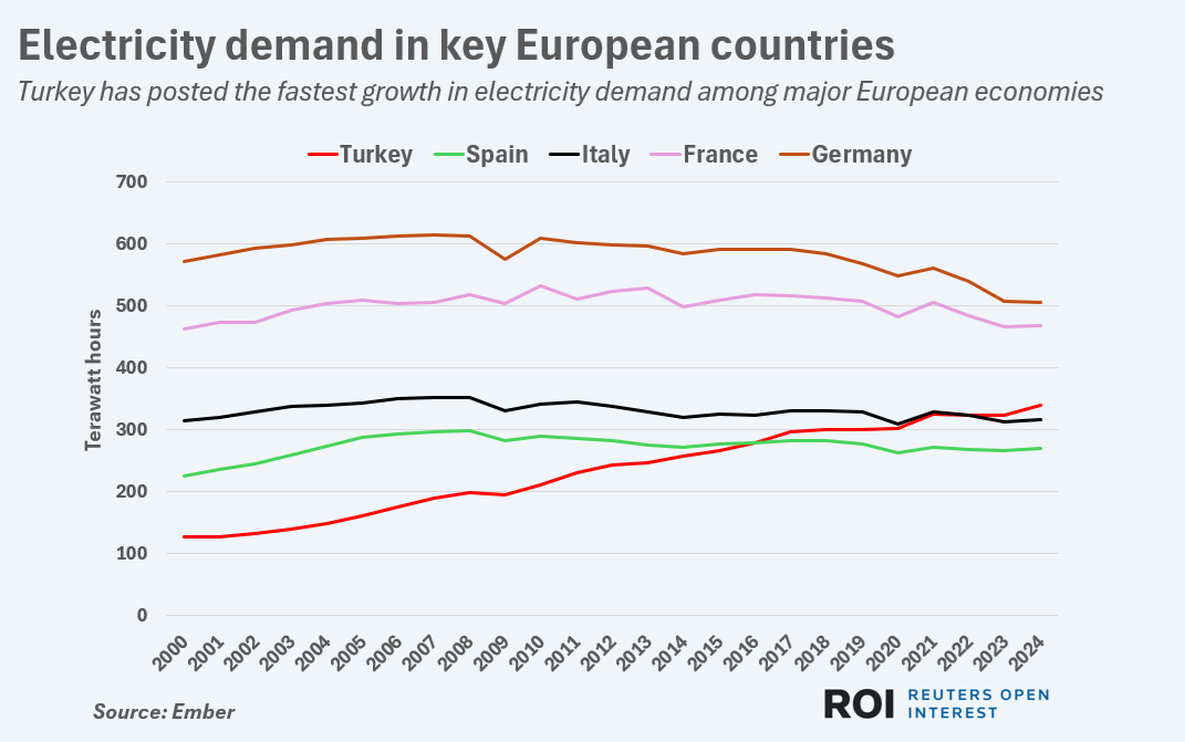 Government spending on infrastructure and the expansion of heavy industry and manufacturing have been the main drivers of Turkey's electricity demand, which topped 340 terawatt hours (TWh) in 2024, according to Ember.
