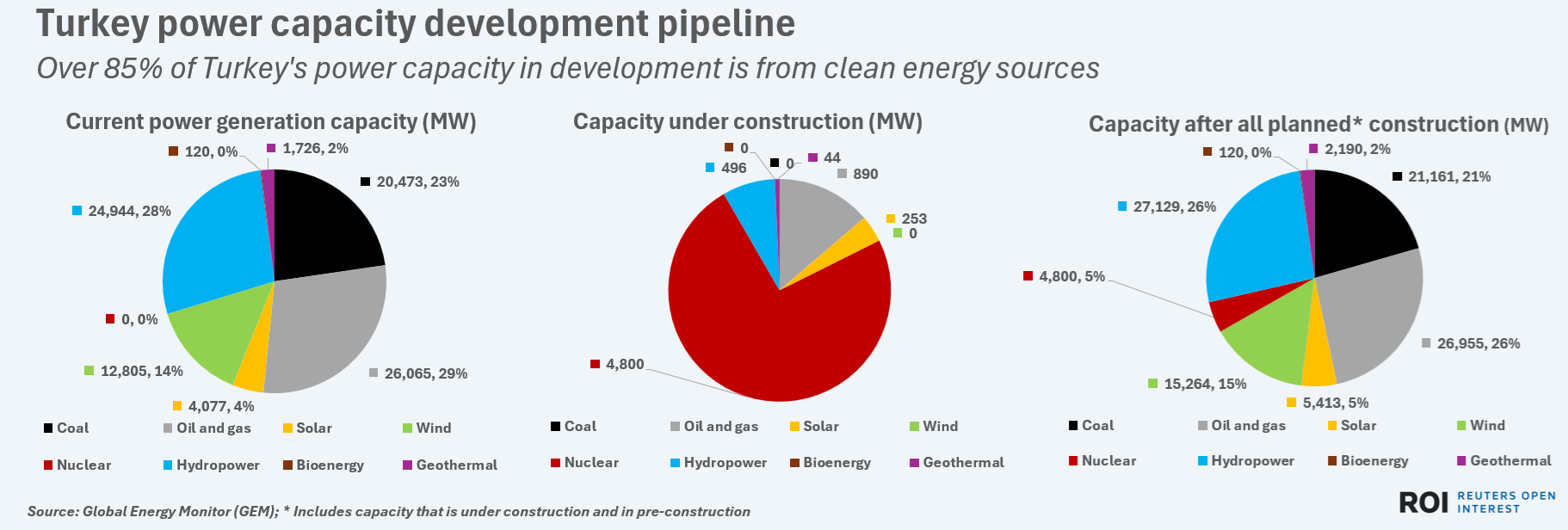 With only 890 MW of new gas capacity and 700 MW of new coal capacity being built, that means clean energy sources dominate the near-term development pipeline for Turkey's power firm, and will account for more than half of total capacity once complete.