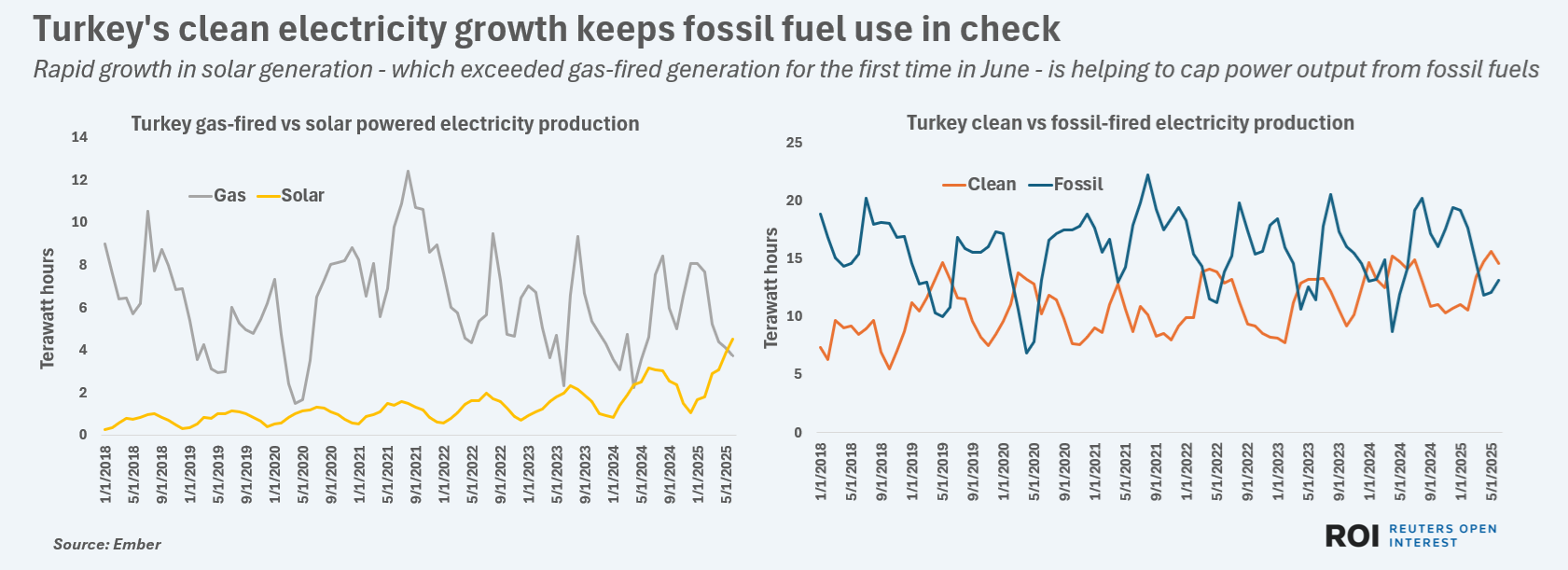 Surging solar capacity lifted Turkey's solar-powered electricity supplies above gas-fired electricity output for the first time last month, while the country's first ever nuclear plant is due to start production within months.