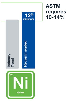 Stainless steels containing elevated levels of Ni can deliver optimal performance in H2 systems. The American Society for Testing and Materials (ASTM) requires a minimum of 10% Ni in 316 stainless steel formulations, but 316 stainless steel with a minimum of 12% Ni is better for the unique challenges posed by H2 (FIG. 4). Ni content helps stabilize the microstructure of stainless steel, enabling it to be more resistant to H2 embrittlement.