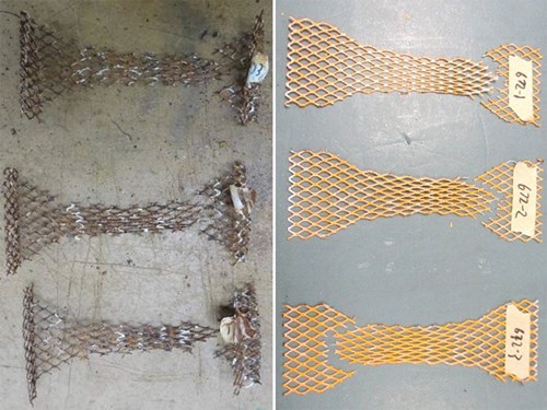 FIG. 1. Samples of filter mesh with G90 coating (left) vs. a powder-coated G90 cartridge filtera (right) after 840-hr ASTM B117 salt spray challenge and tensile test.