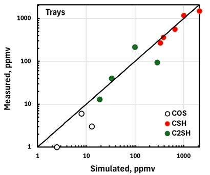 The simplest way to compare simulation with plant measurements is on a parity basis. FIGS. 3 and 4 compare measured and simulated mercaptans and COS levels in the treated liquid from trayed and packed columns, respectively.