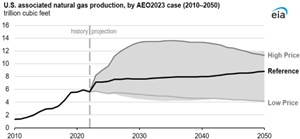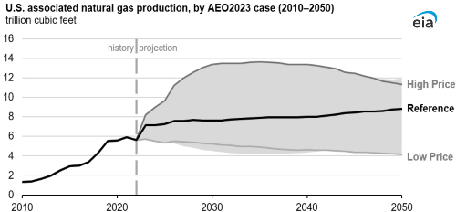 In our Annual Energy Outlook 2023 (AEO2023), natural gas production from oil formations, known as associated natural gas, grows across most cases through 2050, continuing a long-term trend. In the AEO2023 Reference case, we project that associated natural gas will account for approximately 20% of total U.S. natural gas production over that period, and we examined cases in AEO2023 where it makes up as much as 32% of production.