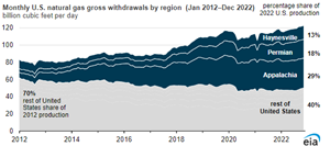 The Permian region in western Texas and New Mexico is the second-largest U.S. natural gas producing region, accounting for 18% of U.S. production. In 2022, gross natural gas withdrawals rose by 2.6 Bcf/d in the Permian, averaging 21.0 Bcf/d.