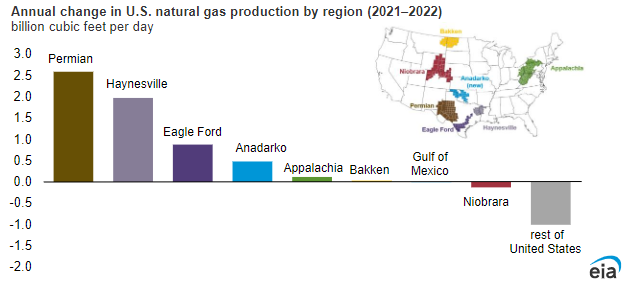 U.S. natural gas production grew by 4% (4.9 billion cubic feet per day [Bcf/d]) in 2022, averaging 119 Bcf/d. Three regions—Appalachia, Permian, and Haynesville—accounted for 60% of all U.S. production in 2022, similar to the proportion in 2021.