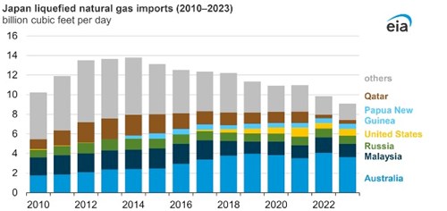 Australia has been Japan’s largest LNG supplier for 11 years; its share of Japan’s total LNG imports more than doubled from 18% in 2012 to 42% in 2023. Qatar—which was ranked second in 2012—is now the seventh-largest LNG supplier to Japan. Qatar provided 4% of Japan’s LNG imports last year, down from 18% in 2012, in part because some of Japan’s long-term contracts with Qatar expired. In 2023, Malaysia was Japan’s second-largest LNG supplier, accounting for 16% (1.4 Bcf/d) of LNG imports. However, in 2012, before Australia took its long-standing top spot, Malaysia supplied 19% of Japan’s LNG imports and was the largest supplier. Other significant LNG suppliers in 2023 included Russia at 9% (0.8 Bcf/d), the United States at 8% (0.7 Bcf/d), and Papua New Guinea at 6% (0.5 Bcf/d).