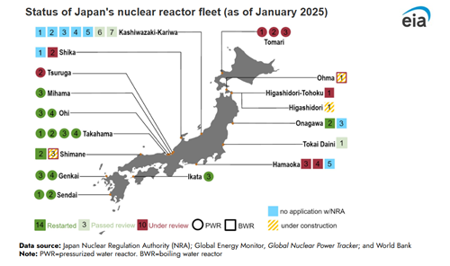 Japan suspended its nuclear fleet from 2013 to 2015 for mandatory safety checks and upgrades following the 2011 Fukushima Daiichi accident. Before the accident, 54 commercial nuclear reactors were operating in Japan, and nuclear power accounted for approximately 30% of the country’s electricity generation. Nuclear restarts have proceeded slowly since the first two units (Sendai Units 1 and 2) were restarted in 2015. Restarts have been slow due to a significantly more stringent safety inspection and authorization process established after the accident and local court injunctions emerging from ongoing public safety concerns in some regions. Public support for restarts has been growing in Japan recently, however.