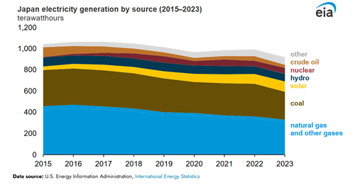 The suspension of Japan's nuclear fleet after the Fukushima accident significantly increased dependence on natural gas, oil, and coal imports to make up for lost domestic nuclear generation. It also significantly increased the installed capacity of solar photovoltaic generation in the country, according to data from Japan’s Ministry of Economy, Trade and Industry. Japan has limited domestic fossil fuel resources and imports virtually all the fossil fuels it uses. Consequently, Japan is the world's second-largest importer of liquefied natural gas (LNG) after China and the third-largest importer of coal.