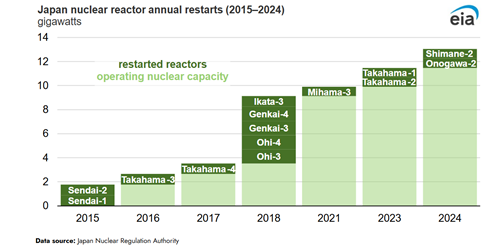 Japanese utilities restarted two additional nuclear reactors in 2024 that had been suspended from operations in response to the 2011 Fukushima Daiichi accident, taking the total number of restarted reactors to 14 since the accident.