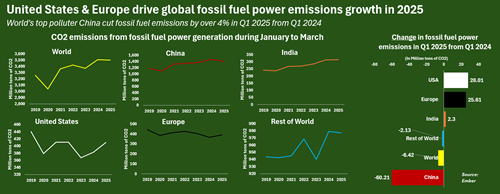 The United States and Europe emitted a combined 801 MM tonnes (t) of carbon dioxide (CO2) from fossil fuel-based power production during January to March, data from Ember shows.