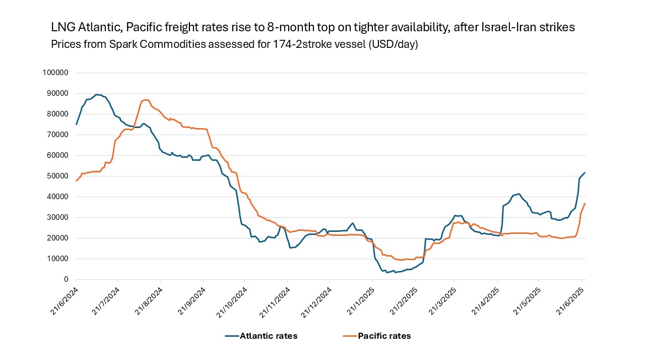 "This rise in global LNG freight rates has been largely due to tight vessel availability, which in turn has been caused by a shift in pricing signals for U.S. cargoes," said Spark Commodities analyst Qasim Afghan. "This has been further exacerbated by market sentiment around the developing situation in the Middle East."