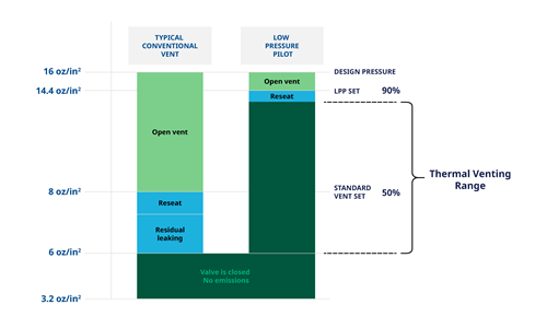 The performance difference of an LPP valve is shown in FIG. 2. The PRV can be set just below design pressure, while still providing the required capacity at full lift. This allows the PRV set pressure to be raised to within 90% of design, minimizing valve release events. The LPP valve also seats much better when operating near setpoint, so fugitive emissions and product loss are dramatically decreased. Finally, the design allows pilot adjustment to be set to either snap or modulating action to suit the application. A snap-acting PRV immediately opens to full lift at setpoint and closes as pressure falls below setpoint. A pilot set to modulating action, however, will only open the valve in proportion to the rise in tank pressure, so lift is dependent on the magnitude of the relief event. This in turn minimizes the amount of product being released rather than with a full-open relief event, as with snap-action.