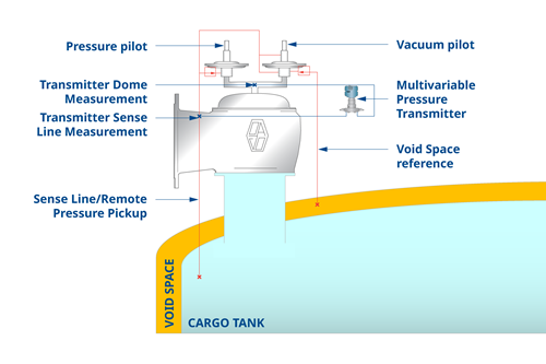 FIG. 6. This dual pilot PRV design allows a single PRV to provide pressure and vacuum relief, with the vacuum referenced to the Moss tank void space. A multivariable DP pressure transmitter (shown in blue) monitors tank pressure, along with PRV event duration and quantity.