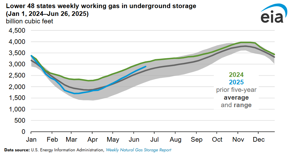 The previous 30-day volatility eased in 2Q25 as weekly injections grew. From late April through June, net injections into storage were particularly robust, surpassing 100 Bft3 per week the week of April 25 for the first time this year, according to The U.S. Energy Information Administration’s (EIA’s) Weekly Natural Gas Storage Report. Net injections totaled more than 100 Bft3 per week for seven consecutive weeks, the longest stretch since 2014. Natural gas storage inventories began increasing the week of March 14, and by the end of 2Q 2025, inventories were 6% (173 Bft3) above the previous five-year (2020–2024) average. The increased inventories and pace of the storage injections reduced concerns regarding supply availability, and price volatility declined.