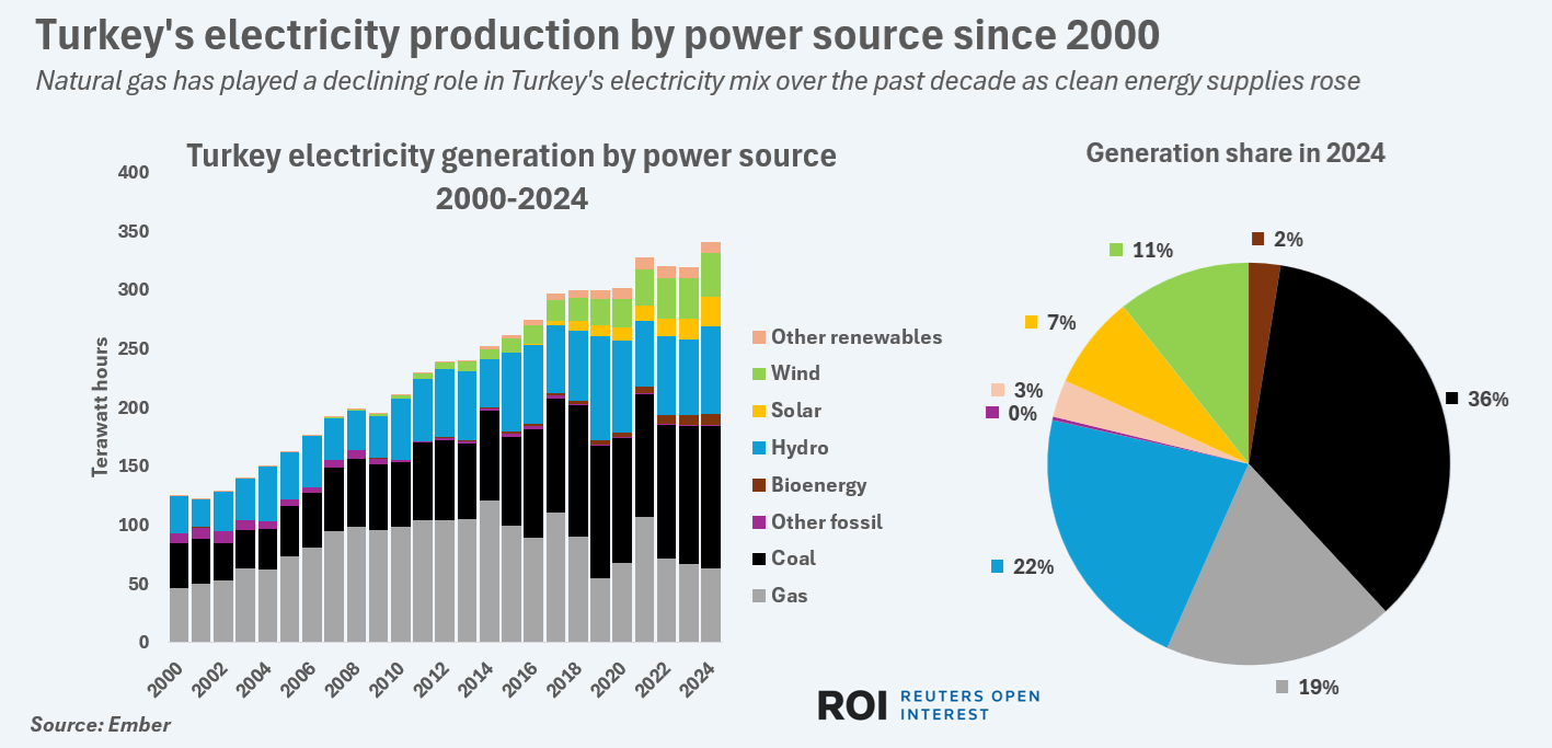 Government spending on infrastructure and the expansion of heavy industry and manufacturing have been the main drivers of Turkey's electricity demand, which topped 340 terawatt hours (TWh) in 2024, according to Ember.