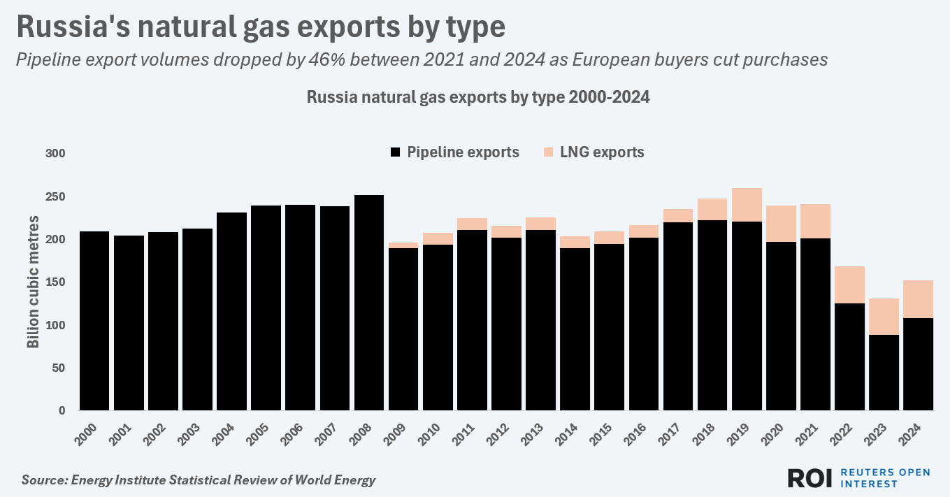 Russia's exported gas volumes via pipeline dropped by 38% in 2022 from the previous year, and again by 30% in 2023 from 2022's total as European buyers switched to imported LNG and other fuels to replace those lost gas supplies.
