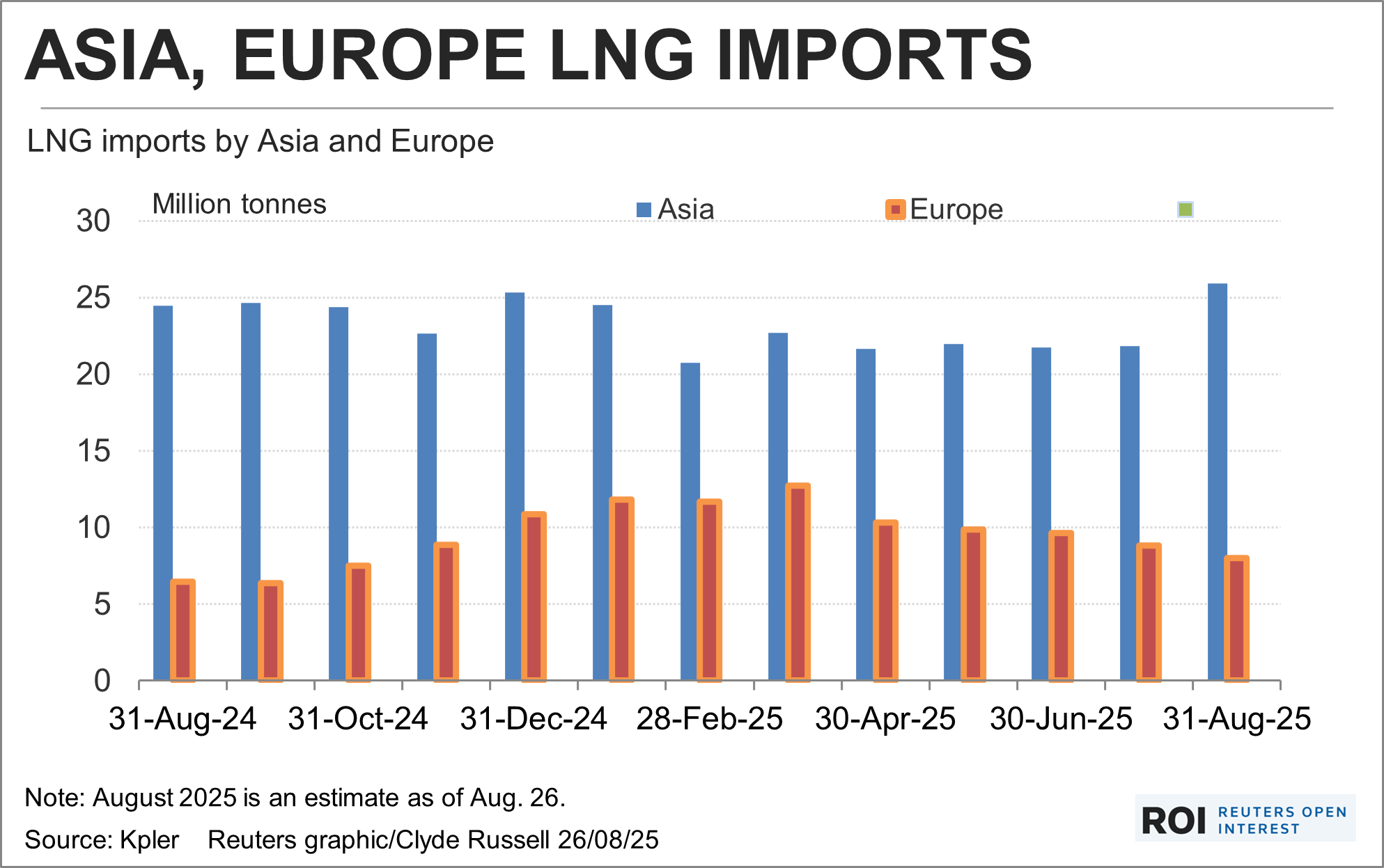 For the first eight months of the year Europe's LNG imports are 82.71 MMt, 22.1% higher than the 67.74 MMt for the same period in 2024, according to Kpler data.