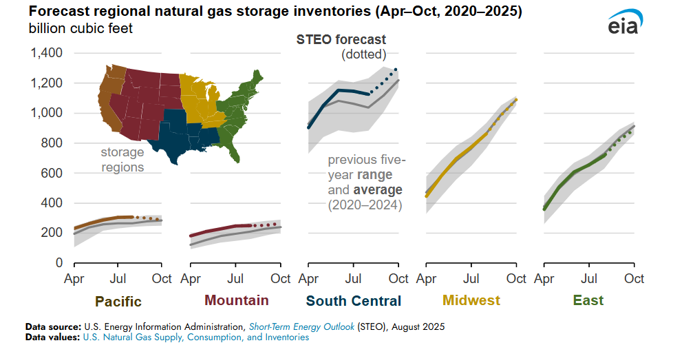 The South Central, Midwest, and East storage regions contributed the most to increasing storage volumes in prior months. The EIA forecasts inventory in the South Central region will remain above the five-year average through October and end the season at the highest level since 2016. The EIA expects inventories in all other regions will end October near their five-year average levels.