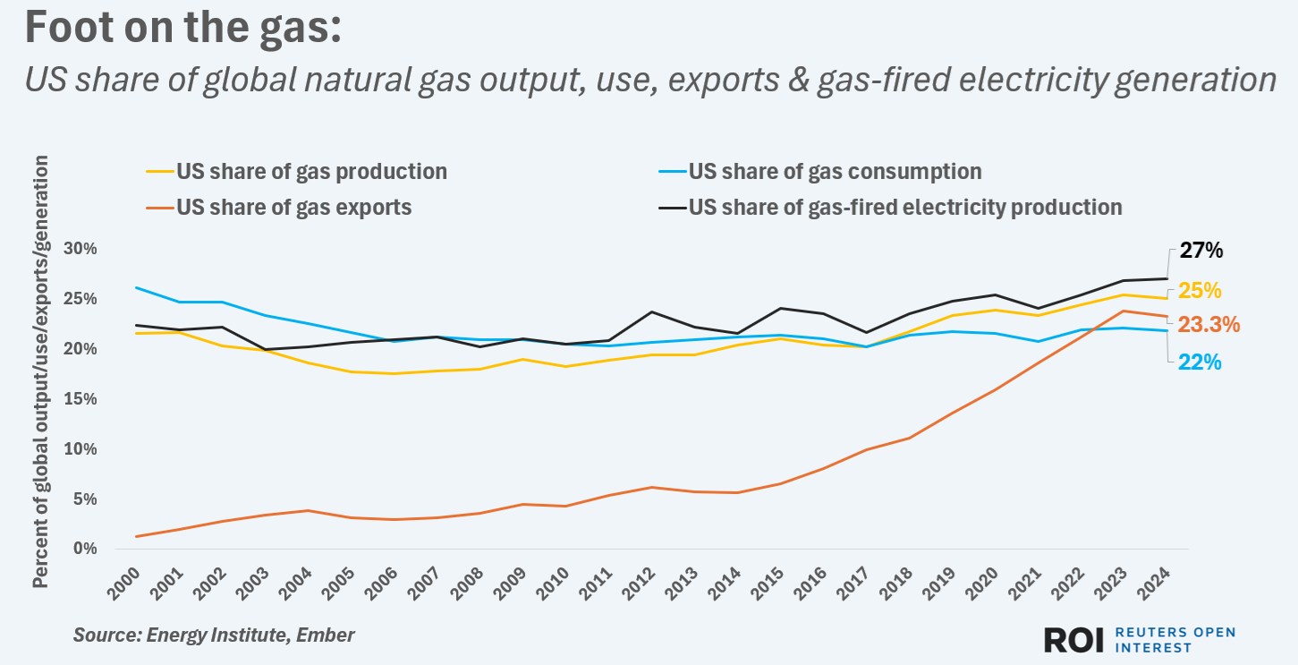 Hitting the gas. The United States accounts for roughly a quarter of global gas production, use and exports, and around 27% of worldwide electricity generation from gas-fired power plants, data from the Energy Institute and energy think tank Ember show.